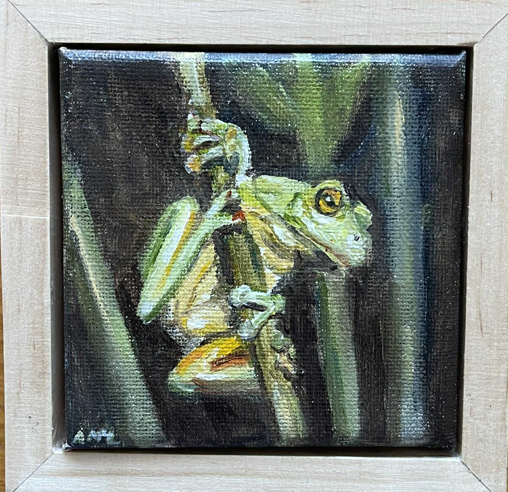 I just love frogs! This little oil painting is a fun reminder of the small wildlife we have around. It is framed in a hand made timber frame and is ready to hang. The canvas is 10cm x 10cm.